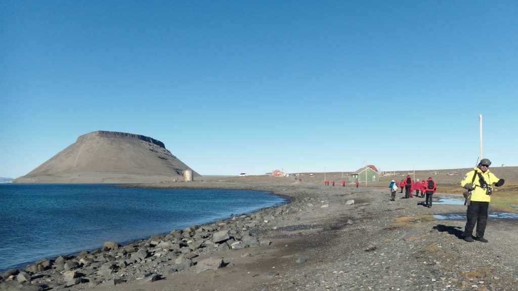 Pour notre dernier jour au Groenland, Ponant a choisi de nous débarquer dans la région de Thulé, au pied du mont Dundas. Thulé est le nom de la base aérienne de Thulé, construite en 1953 par les États-Unis à l’emplacement du petit village de Pituffik. La base aérienne est une enclave américaine sur le territoire danois, membre de l’OTAN. Les habitants, qui vivaient ici depuis des temps immémoriaux, ont été déplacés 100 km plus au nord, à Qaanaaq, ville construite “avec l’aide des États-Unis“, selon la formule politiquement correcte de l’époque. Quelques jours pour abandonner une terre ancestrale et s’implanter dans une zone aride et battue par les vents : l’une des tristes conséquences de la guerre froide. Littéralement. L’accès à la base aérienne est interdit, ça va de soi : aucune visite de ce site militaire toujours opérationnel.